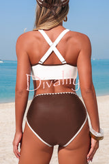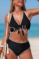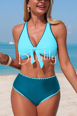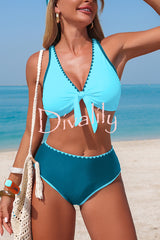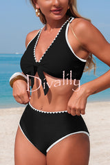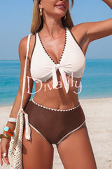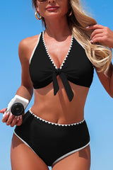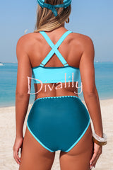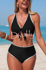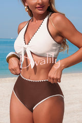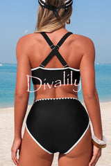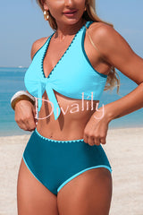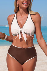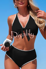 Stylish color-blocked trim high-waisted two-piece stretch bikini swimsuit