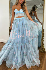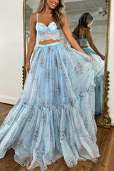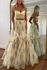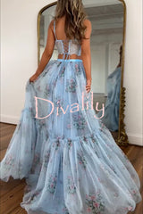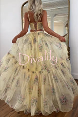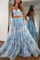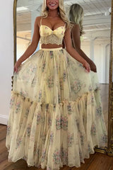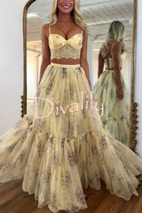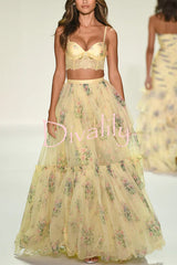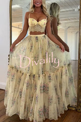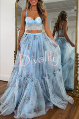 Vita floral satin bow lace back lace-up crop tank and tulle high rise a-line maxi skirt set