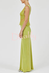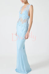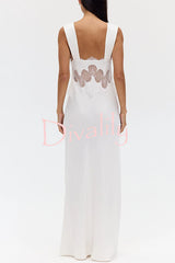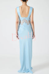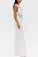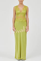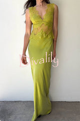 Effortless elegance satin sheer lace patchwork v-neck drape maxi dress
