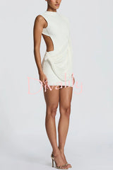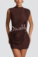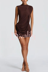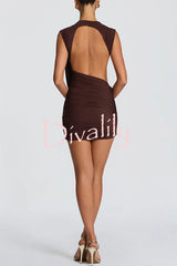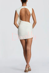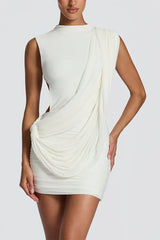 Mireya mesh and knit fabric high neck diagonal drape backless mini dress