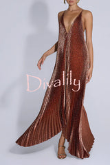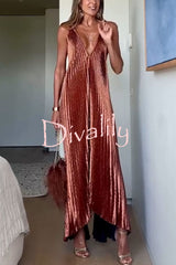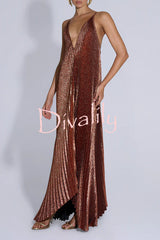 - This muse gown is flowing and ethereal, yet bold and unrestrained. Our signature pleated fabric drapes elegantly over the floor, perfectly accentuating the figure. A deep V-neck and delicate straps highlight the collarbone, while the skirt finishes in a refined tulip shape. Our shimmering fabric is luxuriously unique, and the exquisite pleating technique creates this sophisticated and elegant gown.Our distinctive clothing will add instant style to your wardrobe.