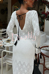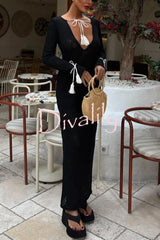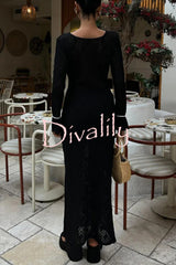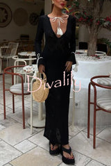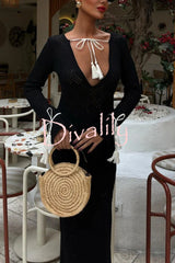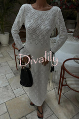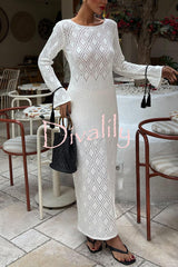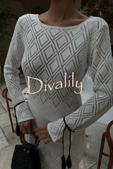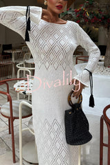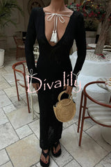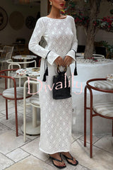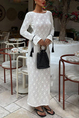 Solid color long-sleeved tie slim-fit knit openwork cover-up maxi dress