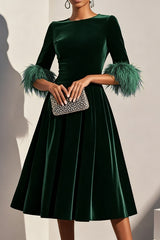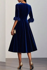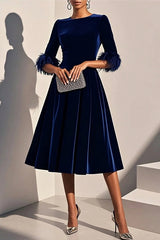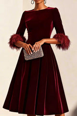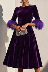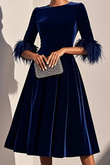 Solid color velvet feather half sleeves elegant fitted waist midi dress