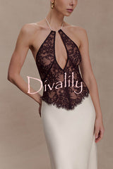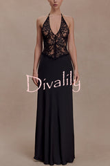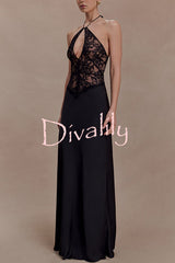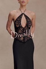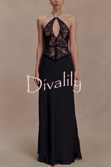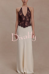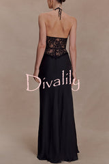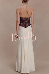 Timeless silhouette lace and satin halter backless drape maxi dress