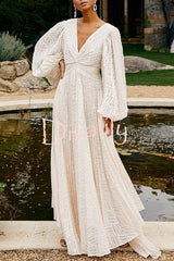 Wedding guests pleated textured chiffon fabric balloon sleeve open back maxi dress
