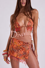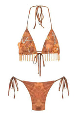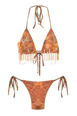 Fashionable tassel pendant halter neck tie two-piece stretch bikini swimsuit