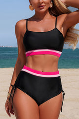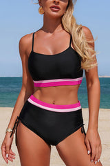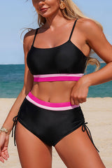 Solid color contrast high-waisted tie-up two-piece stretch bikini swimsuit