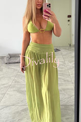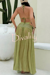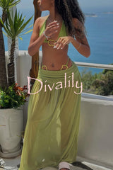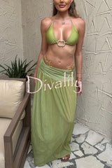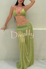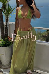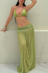 Stylish halter neck tie stretch bikini swimsuit and tulle pleated maxi skirt three-piece set