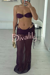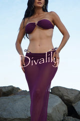 Stylish metallic decoration lace-up stretch bikini swimsuit and sheer pleated maxi skirt three-piece set