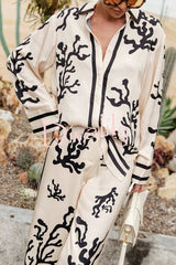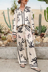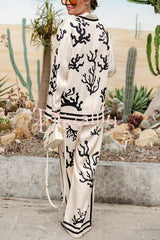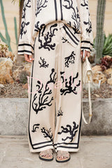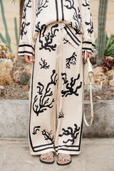 Light and comfortable satin unique print elastic waist pocketed wide leg pants