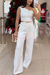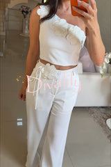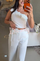 Alick floral detail one shoulder crop top and floral belt high waist pocket wide leg pants set