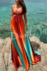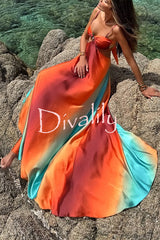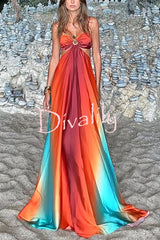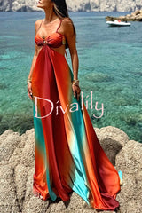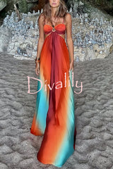 Neon sunset printed metal decoration cutout back tie-up vacation maxi dress
