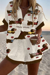 Dachshund print loose button elastic waist shorts set