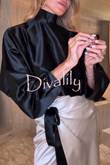Elegant high-neck long-sleeved loose top and cross-strap high-slit maxi skirt set