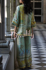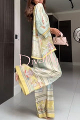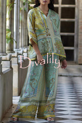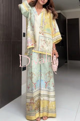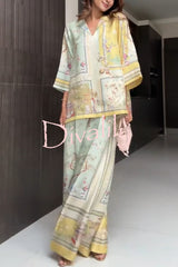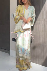 Elonie satin floral print v-neck half sleeve top and elastic waist wide leg pants set