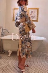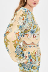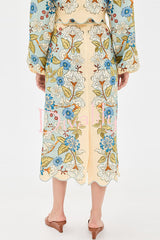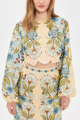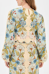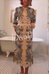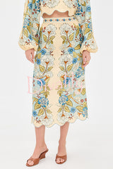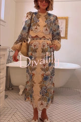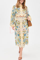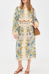 Garden linen blend floral print wavy hem long sleeve top and high rise pocket slit midi skirt set