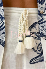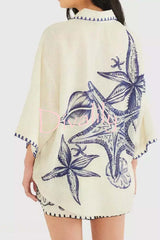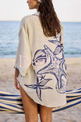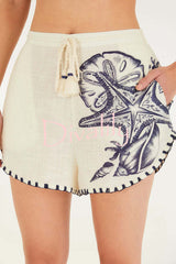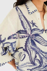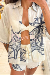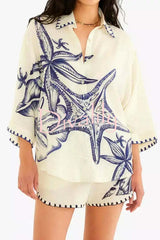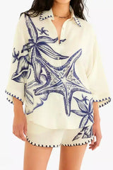 Linen blend starfish print collared loose-fitting shirt and elastic waist casual pocket shorts set