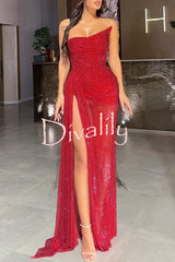 Lysette sequin pleated design irregular off-shoulder slit drape gown maxi dress