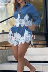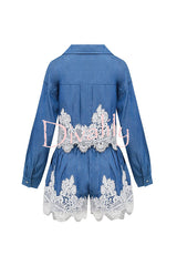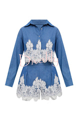 Nasha denim lace trim button long sleeve shirt and high rise pocket wide leg shorts set