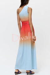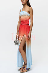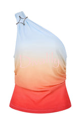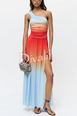 Ocean sunset ombré print starburst brooch one shoulder tank and elastic waist slit maxi skirt set