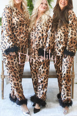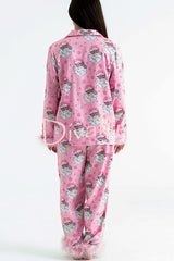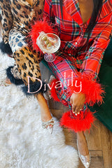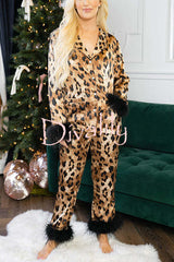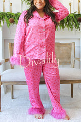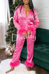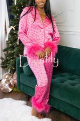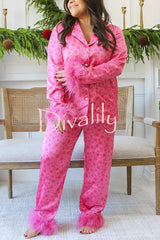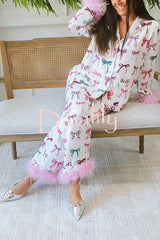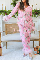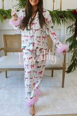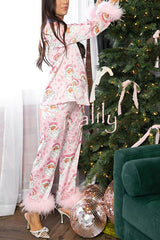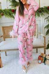 Christmas besties party printed feather trim elastic waist pocketed pajama set