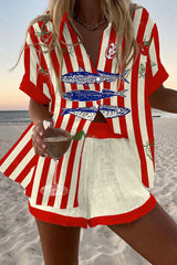 Sardine stripe print loose button elastic waist shorts set