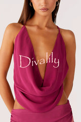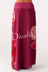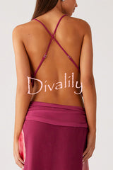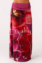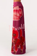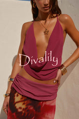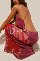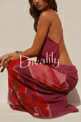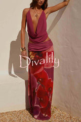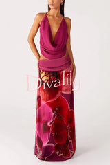 Sexy deep v backless draped camisole top and floral print chiffon maxi skirt set