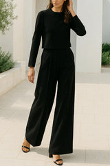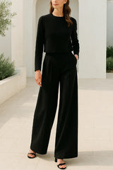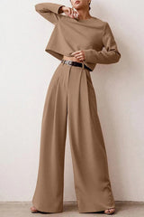 Solid color crew neck long-sleeved cropped top and casual pocket wide-leg pants set