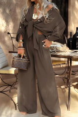 Solid color loose long-sleeved shirt and elastic waist casual pocket wide-leg pants set