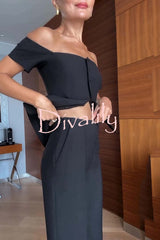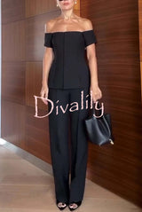 Solid color off-the-shoulder single-breasted top and casual pocket straight-leg pants set