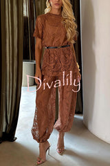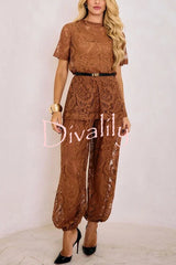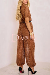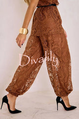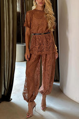Winonah mesh lace short sleeve top and elastic waist loose lantern pants set