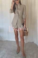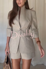 Devora linen blend stand lapel neck half sleeve button pocket blazer and high rise shorts set