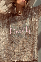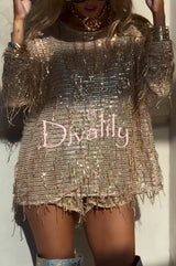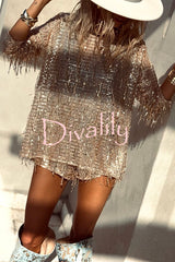 Fashion sequin round neck long sleeve tassel top and elastic waist casual shorts set