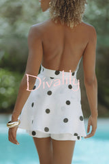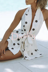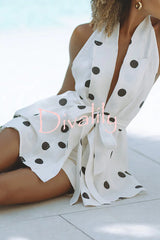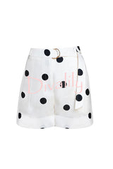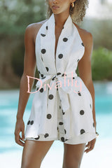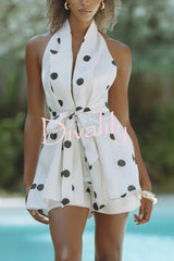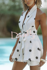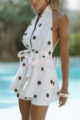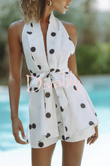 Gabby linen blend polka dot tie-up lapel halter vest and metal ring belt loose shorts set
