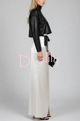 Elegant high-neck long-sleeved loose top and cross-strap high-slit maxi skirt set