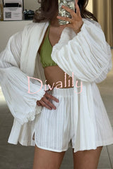 Solid color loose long-sleeved tie-front top and elastic waist casual shorts set