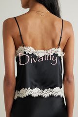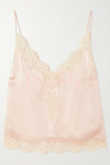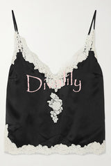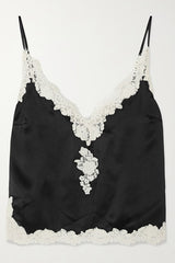 - Designed with "uninhibited femininity" in mind, this camisole radiates light in every piece. Crafted from lustrous silk-satin, this camisole is embellished with delicate guipure lace for a romantic, lingerie-inspired look. Adjustable straps for the perfect fit.