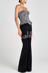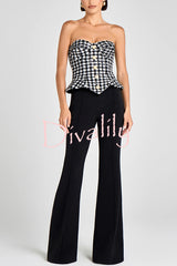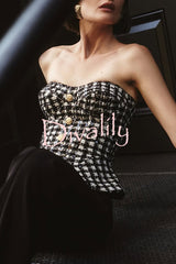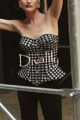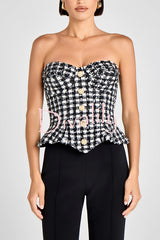 Maya check bouclé-tweed fabric sweetheart neck gold button strapless tank