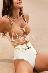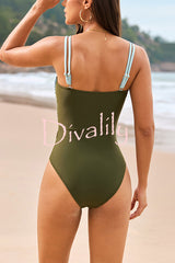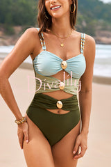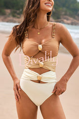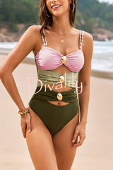 Fashionable color-blocked metal button stretch one-piece swimsuit