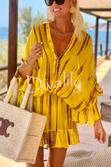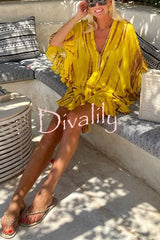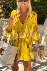 Lemon flavor tie dye ruffle batwing sleeve elastic waist kaftan mini dress