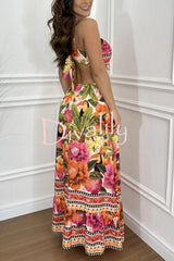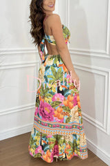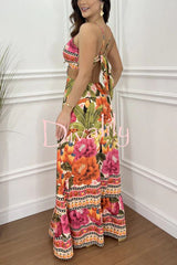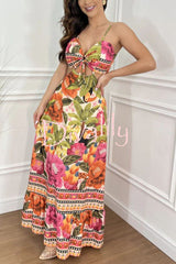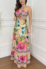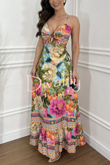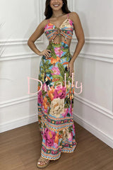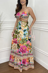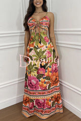 Mexico style tropical print ring cutout lace-up vacation maxi dress