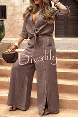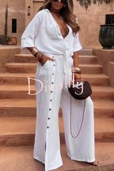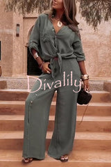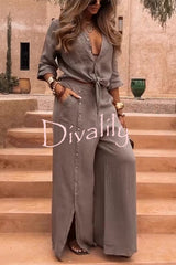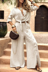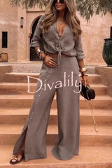 Solid color lapel casual button-down shirt and loose pocket slit wide-leg pants set