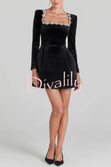 - This luxurious black velvet mini dress features a square neckline with dramatic bejeweled trim and features shoulder pads and internal bodice boning to provide shape and support to the bodice. Two pleats at the front and back of the skirt enhance the silhouette, while a rear zipper at the back ensures a stylish look.Our distinctive clothing will add instant style to your wardrobe.