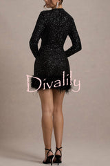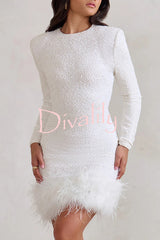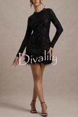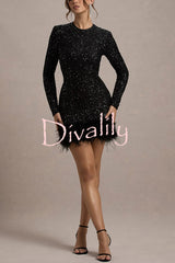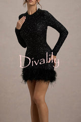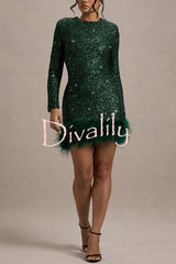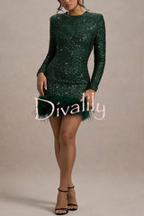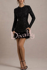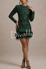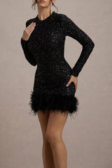 - We have so many sparkling sequin decorations that are truly a must-have for party season. This dress features a high neckline, long sleeves and padded shoulders to accentuate your curves. What makes this mini dress even more memorable are the feathers on its short hem.