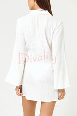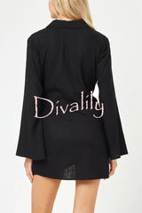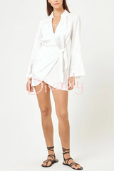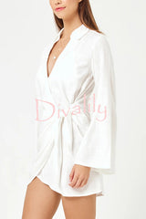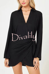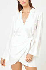 Solid color casual long-sleeved v-neck tie waist mini dress