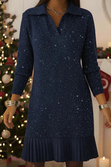 Solid color collared long-sleeved casual pleated knit mini dress