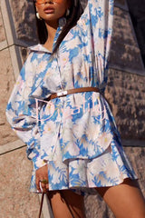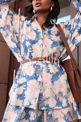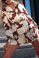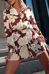 Botanical print collared long-sleeved loose-fitting shirt and elastic waist casual shorts set
