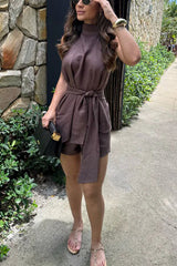 Sira linen blend tie-up halter backless tank and elastic waist pocket loose shorts set