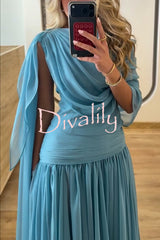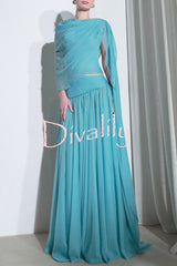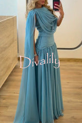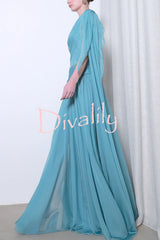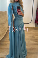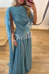 Solana draped sheer cape top and high waist pleated slit maxi skirt set