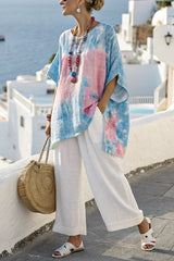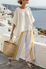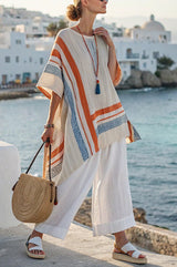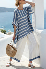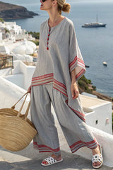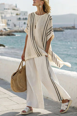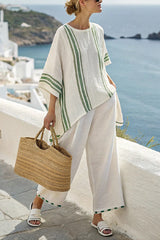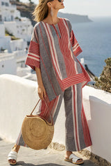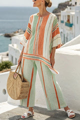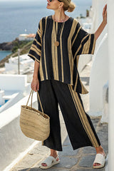 Striped print crew neck loose top and elastic waist casual wide leg pants